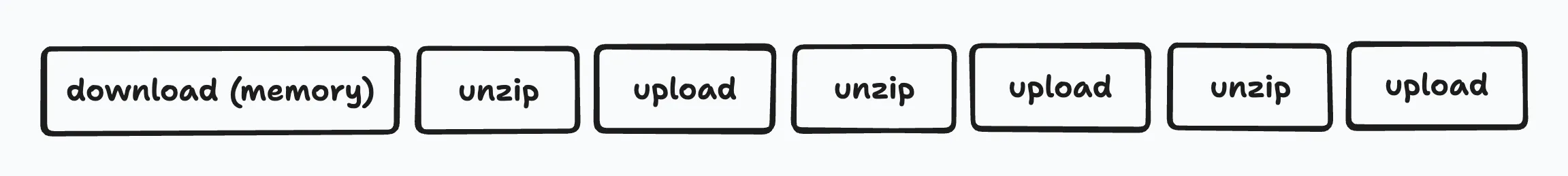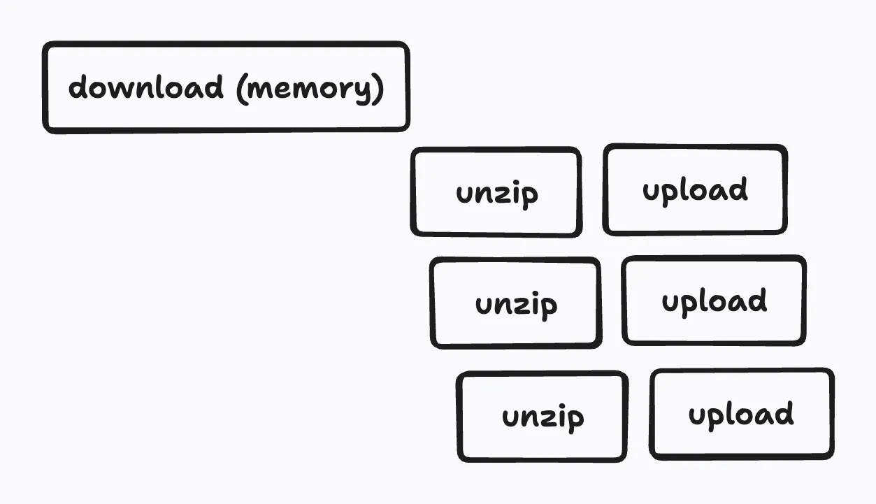 しかし、アップロード部分のみの改善を検証するために7zaで結果をディスクに展開する作りにしていましたが、実際のユースケースでは、展開後のサイズが1TBを超えてしまうような巨大なアーカイブファイルがあることがわかり、それらに対応するために構成を変える必要がありました。