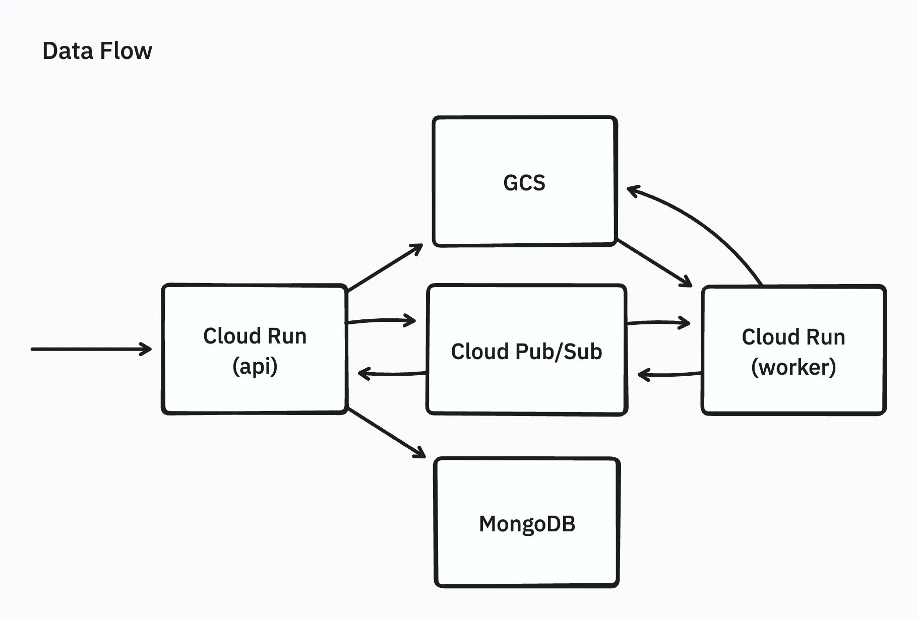 初期の実装はシンプルに、Webブラウザからapi(Cloud Runで動作するAPIサーバー)経由でアーカイブファイルをGCSにアップロードしたあと、ワーカーをCloud Runを用いて起動し、ワーカーでアーカイブファイルの内容をまるごとメモリに載せて展開し、展開されたファイルをGCSに並列アップロードするものでした。